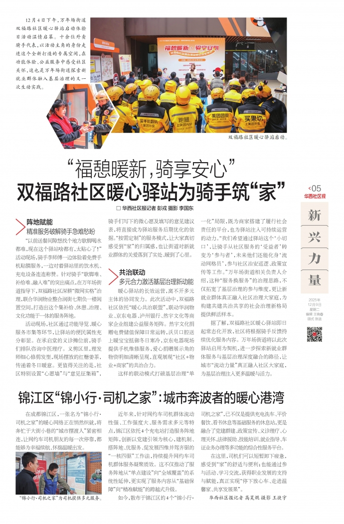 这样的联动模式打破基层治理“单一化”局限,既为商家搭建了履行社会责任的平台,也为驿站注入可持续运营的动力。“我们希望通过驿站这个‘小切口’,让骑手从社区服务的‘受益者’转变为‘参与者’,未来他们还能化身‘流动网格员’,参与社区治安巡逻、政策宣传等工作。”万年场街道相关负责人介绍,这种“服务换服务”的治理思路,不仅拓宽了基层治理的参与维度,更让新就业群体真正融入社区治理大家庭,为构建共建共治共享的社会治理新格局提供鲜活样本。