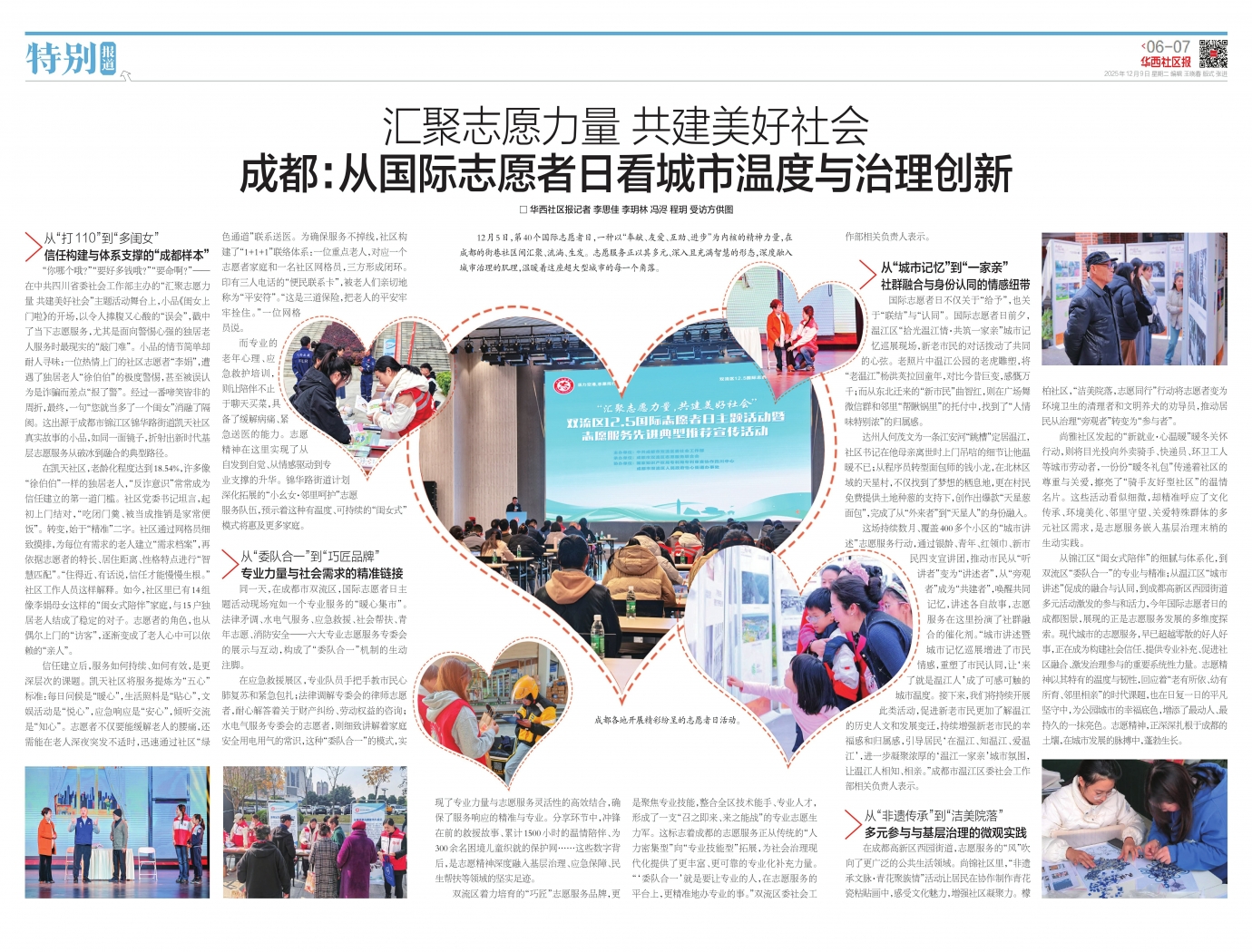 从锦江区“闺女式陪伴”的细腻与体系化,到双流区“委队合一”的专业与精准;从温江区“城市讲述”促成的融合与认同,到成都高新区西园街道多元活动激发的参与和活力,今年国际志愿者日的成都图景,展现的正是志愿服务发展的多维度探索。现代城市的志愿服务,早已超越零散的好人好事,正在成为构建社会信任、提供专业补充、促进社区融合、激发治理参与的重要系统性力量。志愿精神以其特有的温度与韧性,回应着“老有所依、幼有所育、邻里相亲”的时代课题,也在日复一日的平凡坚守中,为公园城市的幸福底色,增添了最动人、最持久的一抹亮色。志愿精神,正深深扎根于成都的土壤,在城市发展的脉搏中,蓬勃生长。