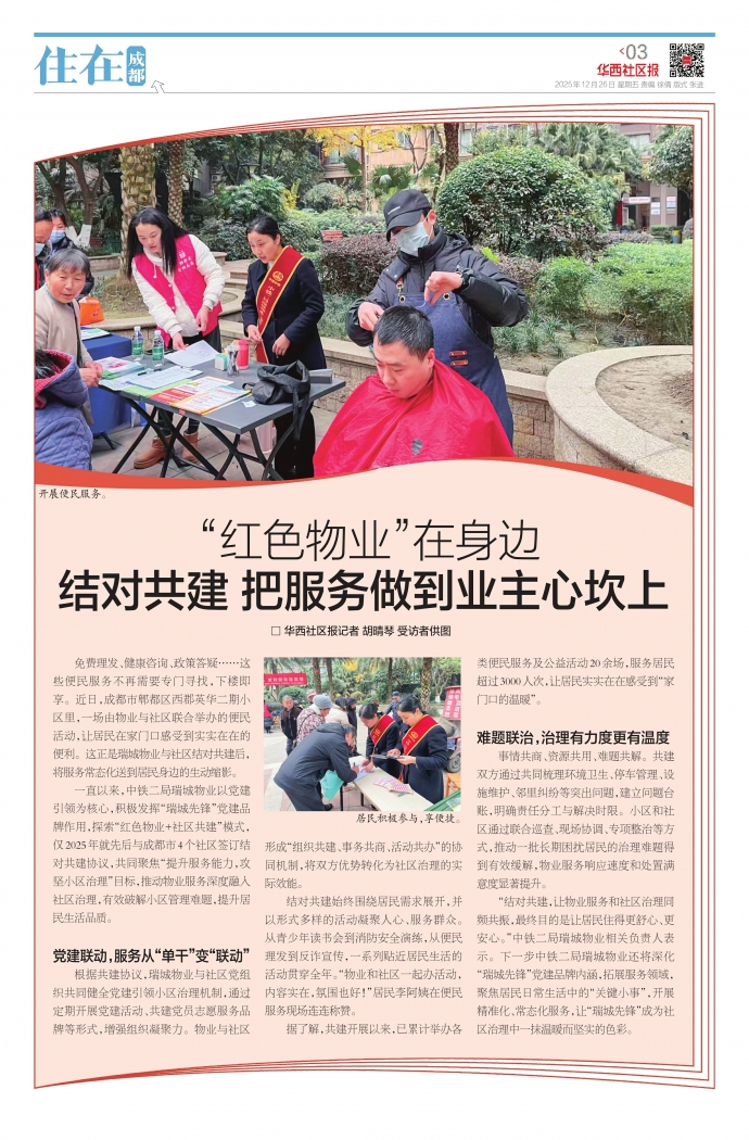 免费理发、健康咨询、政策答疑……这些便民服务不再需要专门寻找,下楼即享。近日,成都市郫都区西郡英华二期小区里,一场由物业与社区联合举办的便民活动,让居民在家门口感受到实实在在的便利。这正是瑞城物业与社区结对共建后,将服务常态化送到居民身边的生动缩影。