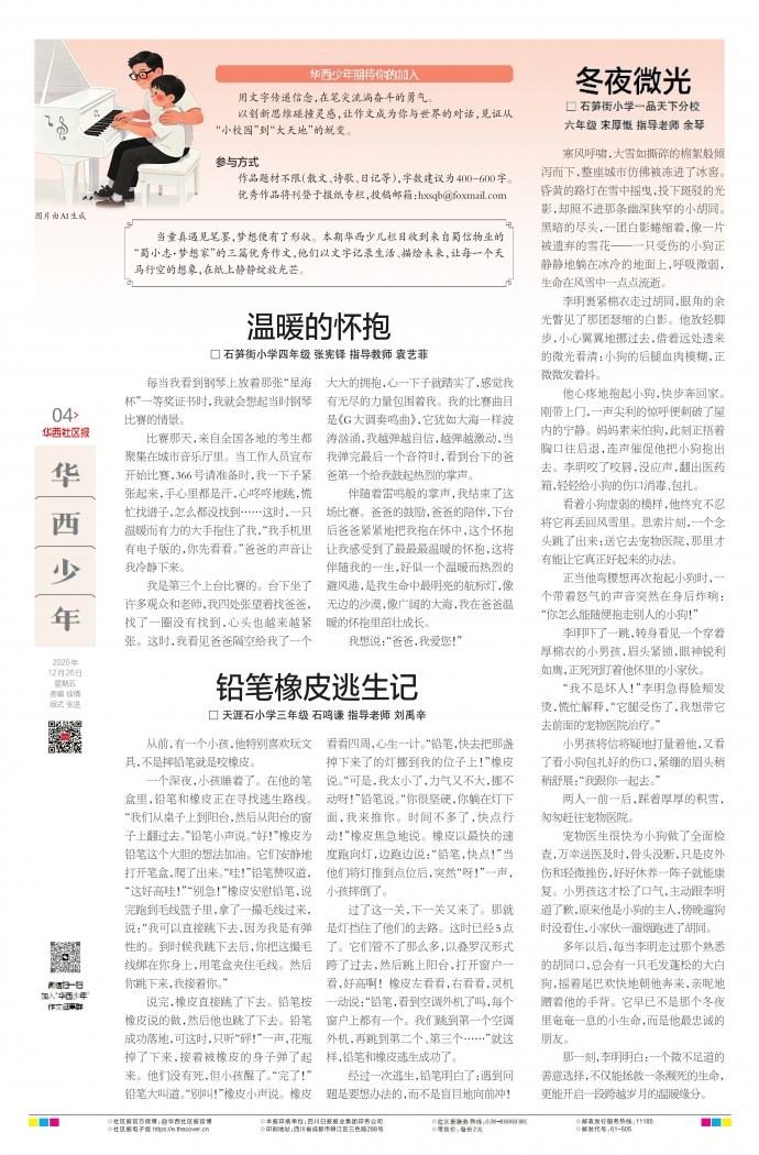 比赛那天,来自全国各地的考生都聚集在城市音乐厅里。当工作人员宣布开始比赛,366号请准备时,我一下子紧张起来,手心里都是汗,心咚咚地跳,慌忙找谱子,怎么都没找到……这时,一只温暖而有力的大手抱住了我,“我手机里有电子版的,你先看看。”爸爸的声音让我冷静下来。