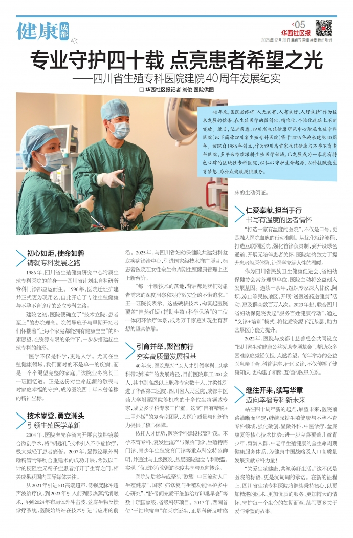 40年来,医院始终将“人无我有、人有我好、人好我精”作为技术发展的信条,在生殖医学的微创化、精准化、个性化道路上不断突破。近日,记者获悉,四川省生殖健康研究中心附属生殖专科医院(以下简称四川省生殖专科医院)将于2026年迎来建院40周年。该院自1986年创立,作为四川省首家生殖健康与不孕不育专科医院,多年来持续深耕生殖医学领域,已发展成为一家具有特色口碑的区域性专科医院,以仁心守护生命起源,以科技赋能生育梦想,为公众健康提供服务。