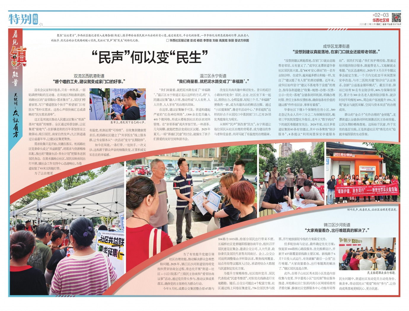 聚焦“众议有方”,华西社区报记者深入成都各镇(街道),探寻那些由居民脱口而出的朴实心愿,通过制度化、平台化的协商,一步步转化为照亮夜路的灯带、托扶老人的把手、优化后的公交线路的暖心实践,见证从“民声”到“民生”的转化之路。