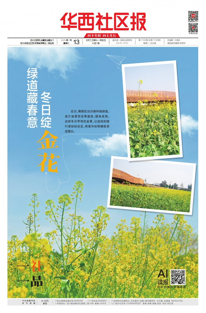 近日,郫都区白沙路环城绿道,成片油菜花迎寒盛放,摇曳成海。这抹冬日罕有的金黄,让途经的骑行者纷纷驻足,将意外的明媚收录进镜头。