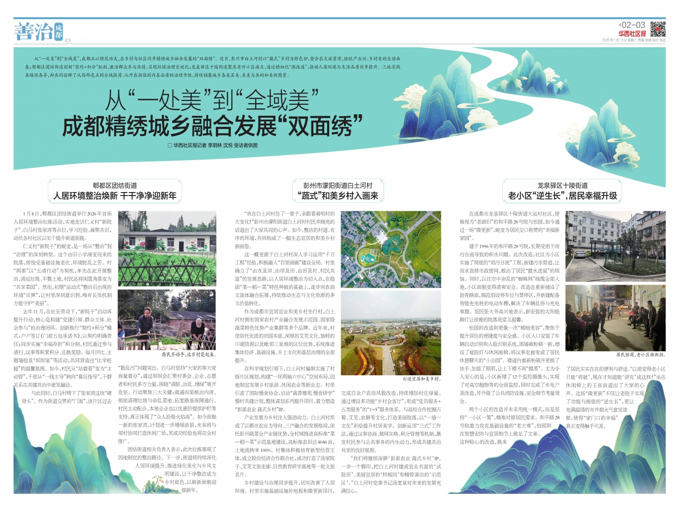 从“一处美”到“全域美”,成都正以绣花功夫,在乡村与社区同步精绣城乡融合发展的“双面绣”。近日,彭州市白土河村以“蔬式”乡村为特色IP,整合农文旅资源,绘就产业兴、乡村美的生动画卷;郫都区团结街道创新“契约+积分”机制,激活群众参与热情,实现环境治理长效化;龙泉驿区十陵街道聚焦老旧小区痛点,通过精细化“微改造”,推动人居环境与生活品质同步提升。三地实践虽路径各异,却共同诠释了从局部亮点到全域提质、从外在颜值到内在品质的治理升级,持续铺展城乡各美其美、美美与共的和美新图景。