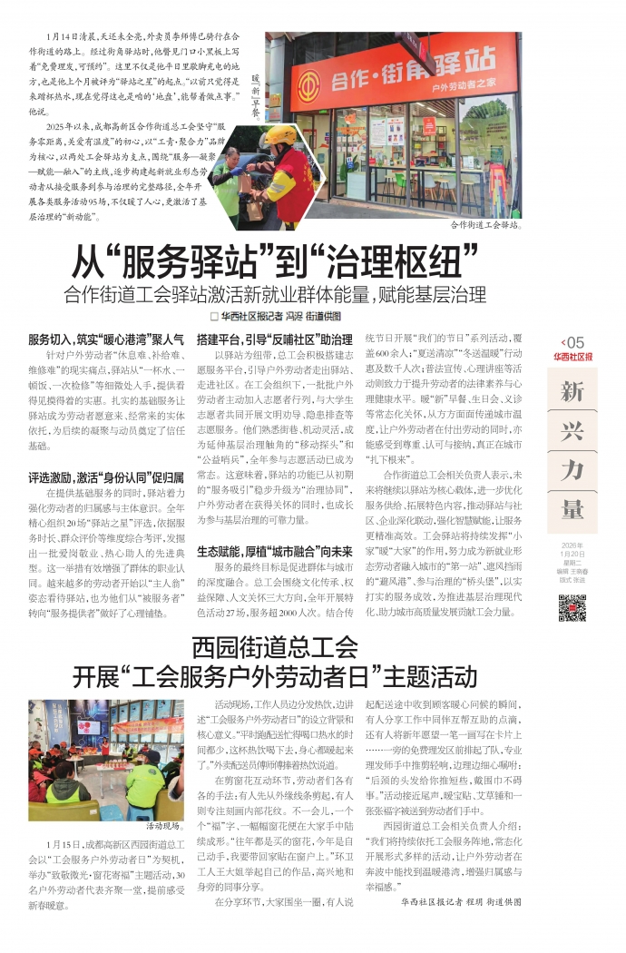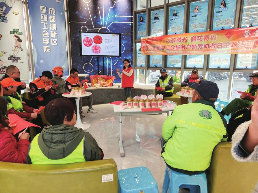 1月15日,成都高新区西园街道总工会以“工会服务户外劳动者日”为契机,举办“致敬微光·窗花寄福”主题活动,30名户外劳动者代表齐聚一堂,提前感受新春暖意。