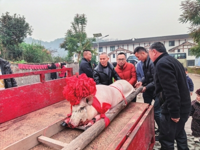 当天一早,祥龙社区居民集体乘车前往干塘村。两小时后,大巴驶入村口,一场以“欢聚‘年猪宴’城乡情谊深”为主题的年猪宴活动拉开序幕。上午10时,头戴大红花的年猪被抬至现场,引来众人围观。孩子们围在一旁,眼中充满好奇,兴奋不已;大人们凝视场景,目光中满是怀念,仿佛重回往日新年。