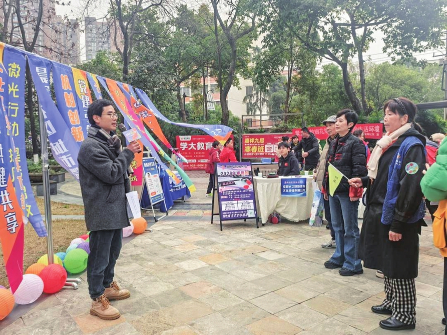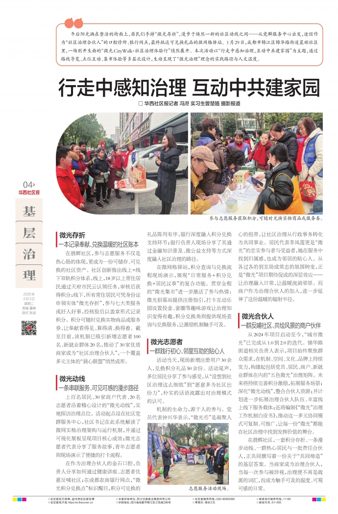 午后阳光洒在整洁的街面上,居民们手持“微光存折”,漫步于焕然一新的社区动线之间——从党群服务中心出发,途经作为“社区治理合伙人”的口腔诊所、银行网点,最终抵达可兑换礼品的微网格驿站。1月29日,成都市锦江区锦华路街道晨辉社区里,一场别开生面的“微光CityWalk·社区治理体验行”悄然展开。本次活动以“行走中感知治理,互动中共建家园”为主题,通过路线导览、点位互动、集市体验等多层次设计,生动呈现了“微光治理”理念的实践路径与人文温度。