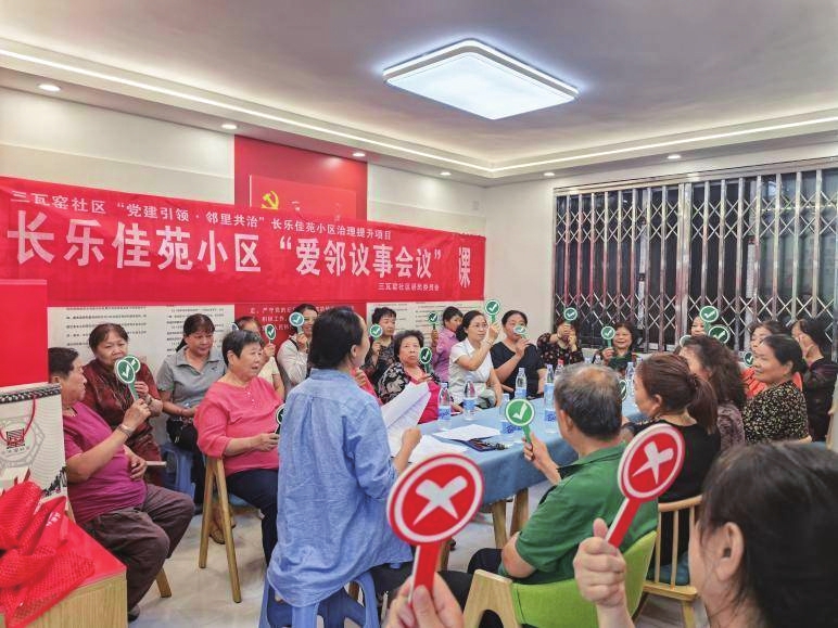 “要是能有个地方,让大家坐下来好好说说心里话就好了。”小区网格员的一句家常感慨竟然变成了现实。在社区居委会、小区党支部、居民自治小组、居民小组议事会、楼栋长及小区网格员的共同努力下,大家遵循“民事民提、民事民议、民事民决、民事民评”的原则建立了常态化、制度化民主协商议事机制,敲定每月18日召开“爱邻议事”会议,协商解决小区内居民诉求反映集中的问题,让民意有了倾诉和落地的平台。
