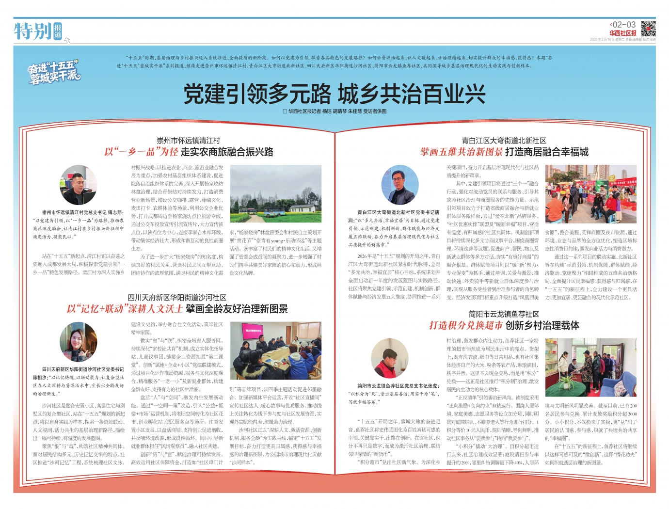 “十五五”时期,基层治理与乡村振兴迈入系统推进、全面提质的新阶段。如何以党建为引领,探索各具特色的发展路径?如何让资源活起来、让人文暖起来、让治理精起来,切实提升群众的幸福感、获得感?本期“奋进‘十五五’蓉城实干派”系列报道,继续走进崇州市怀远镇清江村、青白江区大弯街道北新社区、四川天府新区华阳街道沙河社区、简阳市云龙镇鱼荐社区,共同探寻城乡基层治理现代化的生动实践与创新样本。