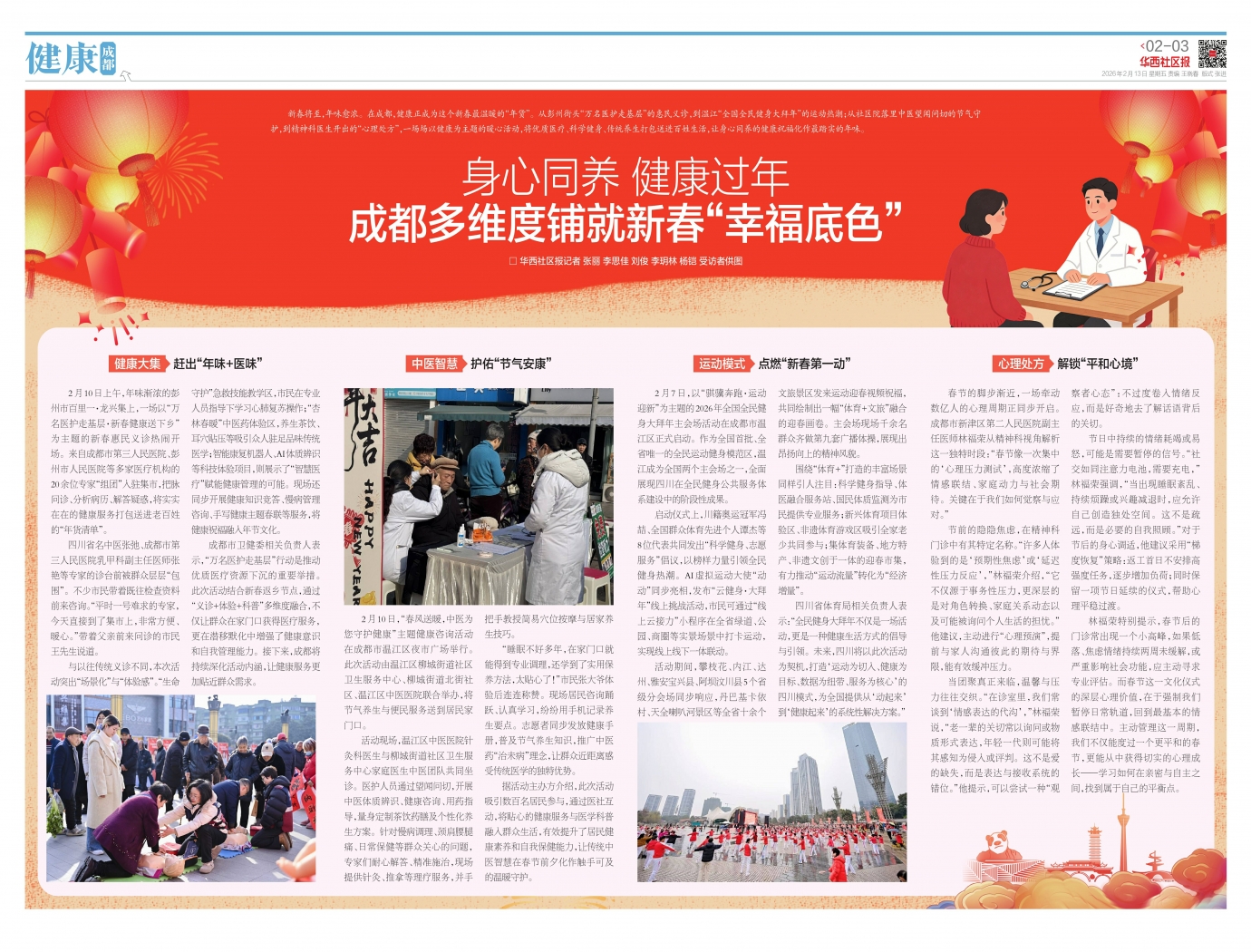 新春将至,年味愈浓。在成都,健康正成为这个新春最温暖的“年货”。从彭州街头“万名医护走基层”的惠民义诊,到温江“全国全民健身大拜年”的运动热潮;从社区院落里中医望闻问切的节气守护,到精神科医生开出的“心理处方”,一场场以健康为主题的暖心活动,将优质医疗、科学健身、传统养生打包送进百姓生活,让身心同养的健康祝福化作最踏实的年味。