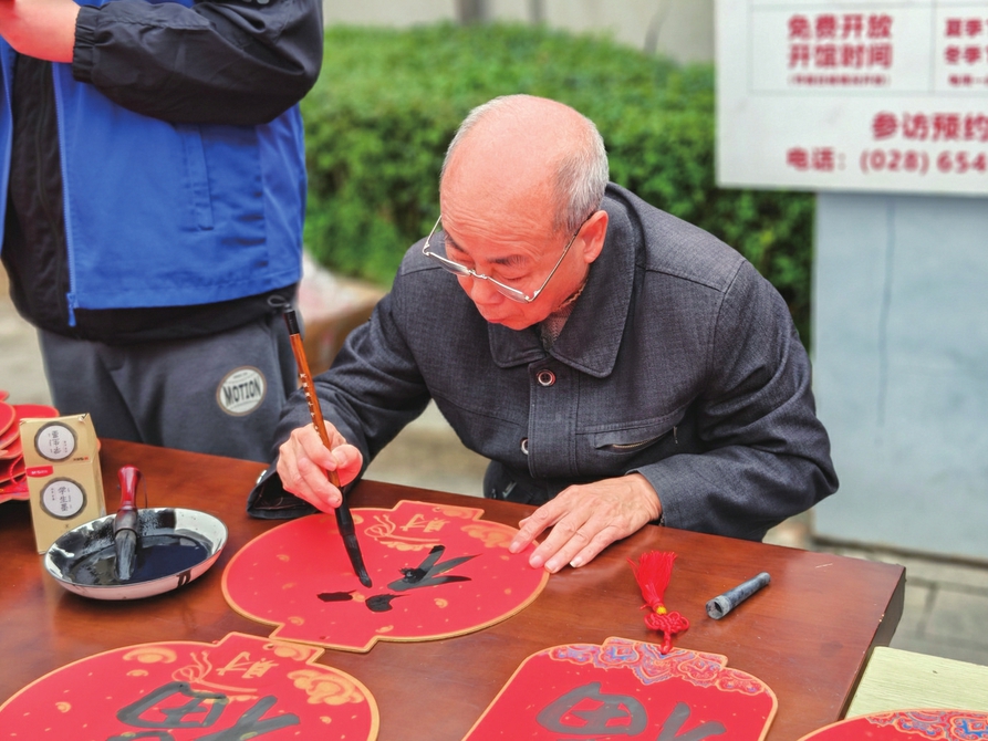 现场写“福”送居民。