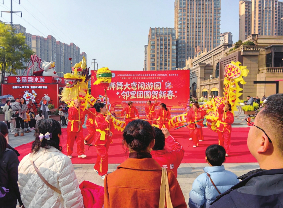 在凤凰湖社区,“狮舞大弯闹游园·邻里团圆贺新春”主题活动热闹上演。伴随着欢快的锣鼓声,雄狮腾跃起舞,瞬间点燃现场气氛。居民们自编自演的舞蹈《看山看水看中国》、舞龙表演轮番登场,展现出对祖国山河的热爱与美好生活的憧憬。游园环节设置“狮头敲锣”“套圈夺宝”“写春联福字”等趣味互动关卡,居民们在集章打卡中体验传统年俗,现场墨香四溢、笑语盈盈。书法协会老师与小小书法志愿者挥毫泼墨,为居民送上寓意吉祥的春联和“福”字,将“文化年味”送到千家万户。
