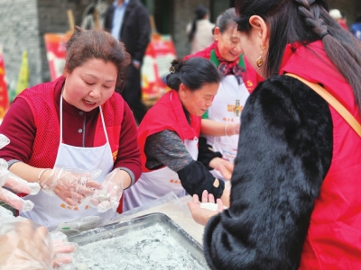 居民与志愿一起包汤圆。
