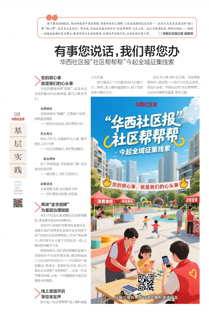 楼下餐馆油烟扰民、刚办的健身卡商家跑路、邻里纠纷无人调解、小区设施损坏迟迟未修……这些天天发生在身边的“烦心事”“揪心事”,您是否正在经历?即日起,华西社区报全新栏目“社区帮帮帮”正式上线。我们不做旁观者,争做行动派——搭建一座链接成都社区与群众、服务邻里与生活的桥梁,让您的声音被听见,让您的难处有人帮。