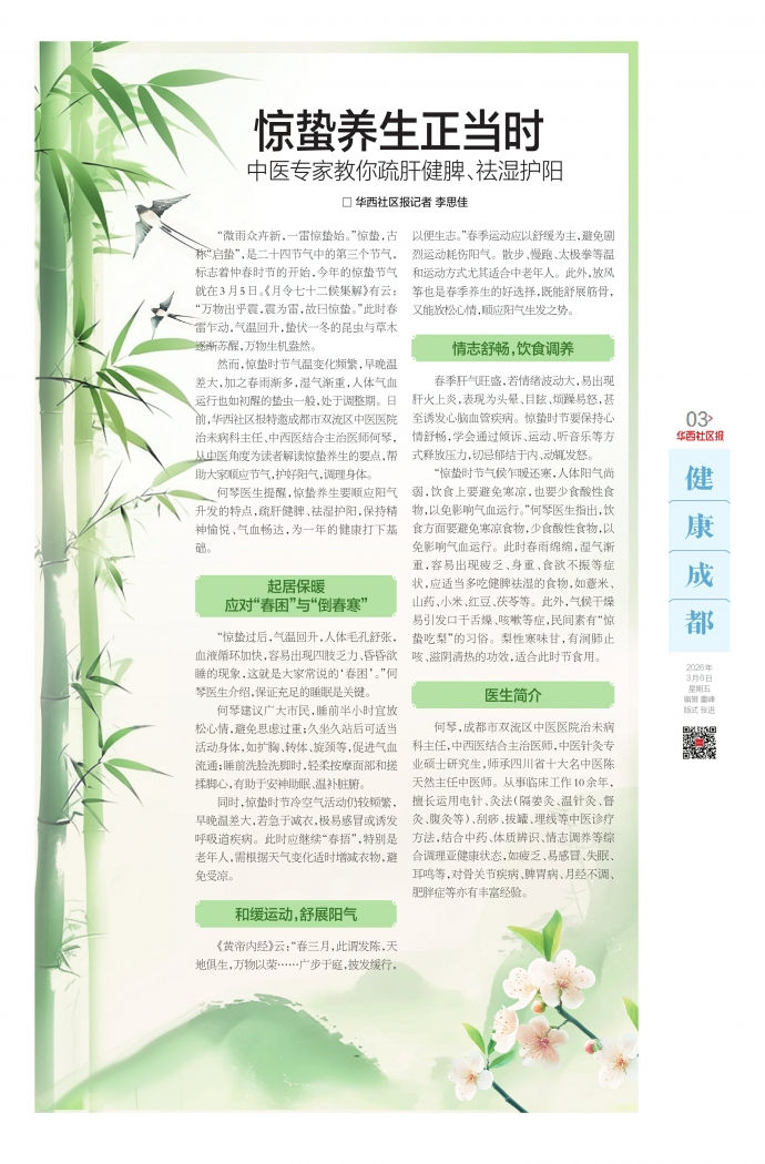 然而,惊蛰时节气温变化频繁,早晚温差大,加之春雨渐多,湿气渐重,人体气血运行也如初醒的蛰虫一般,处于调整期。日前,华西社区报特邀成都市双流区中医医院治未病科主任、中西医结合主治医师何琴,从中医角度为读者解读惊蛰养生的要点,帮助大家顺应节气,护好阳气,调理身体。