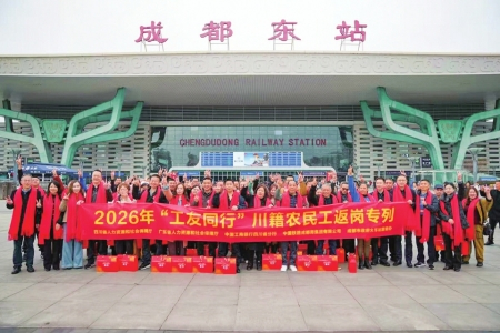 3月2日,由四川省人力资源和社会保障厅、广东省人力资源和社会保障厅、中国工商银行四川省分行联合组织的2026年“工友同行”川籍务工人员免费返岗专列D1809次列车顺利开行。760名川籍务工人员分别从成都东站、眉山站、乐山站、宜宾西站出发,踏上前往广东返岗复工的温暖旅程。