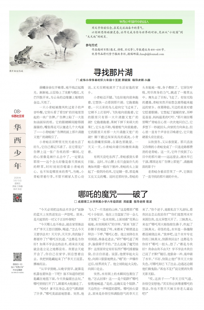 作品题材不限(散文、诗歌、日记等),字数建议为400-600字。优秀作品将刊登于报纸专栏,投稿邮箱:hxsqb@foxmail.com