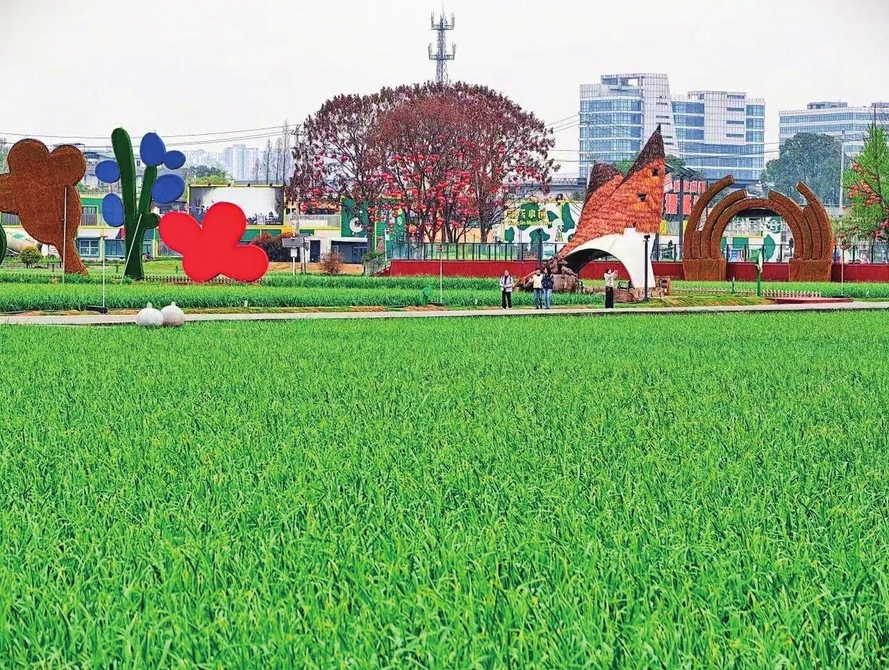 站在田野间远眺,“天府粮仓”四个大字的艺术造型别致醒目。田野里,各式艺术雕塑妙趣横生。小火车穿行在田间小路上,载着游人沉浸式感受自然与人文交融的美好。身着浅色衣裙的游客穿行在花田与麦田之间,或驻足留影,或漫步闲谈。随手一拍都是氛围感满满的森系大片,无需刻意构图,每一张都藏着田园的浪漫与温柔。