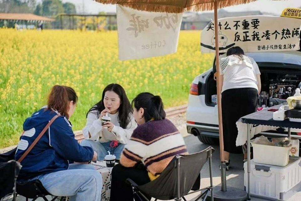 游客在油菜花旁喝咖啡。