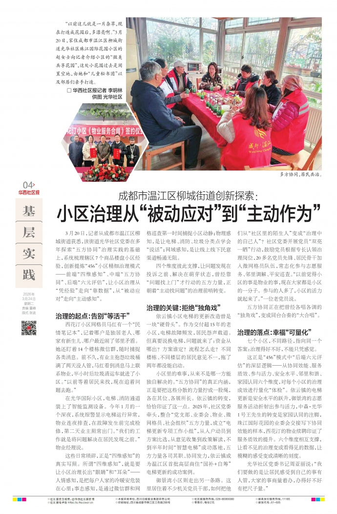 3月20日,记者从成都市温江区柳城街道获悉,该街道光华社区党委在多年探索“五方协同”治理实践的基础上,系统梳理辖区7个商品楼盘小区经验,创新提炼“456”小区精细治理模式——前端“四维感知”、中端“五方协同”、后端“六元评估”,让小区治理从“凭经验”走向“靠数据”,从“被动应对”走向“主动感知”。