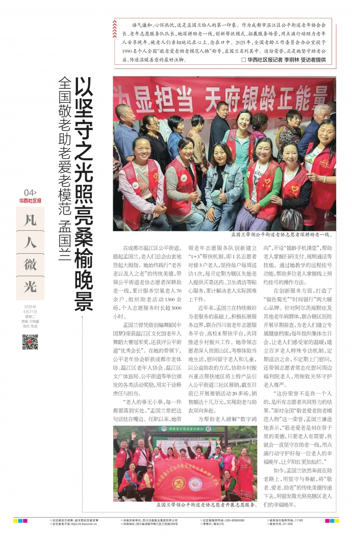 语气谦和、心怀热忱,这是孟国兰给人的第一印象。作为成都市温江区公平街道老年协会会长、老年志愿服务队队长,她深耕助老一线,创新帮扶模式、拓展服务场景,用点滴行动助力老年人安享晚年,被老人们亲切地记在心上、念在口中。2025年,全国老龄工作委员会办公室授予1990名个人全国“敬老爱老助老模范人物”称号,孟国兰名列其中。这份荣誉,正是她坚守助老公益、传递温暖善意的最好注脚。 □华西社区报记者李玥林受访者提供