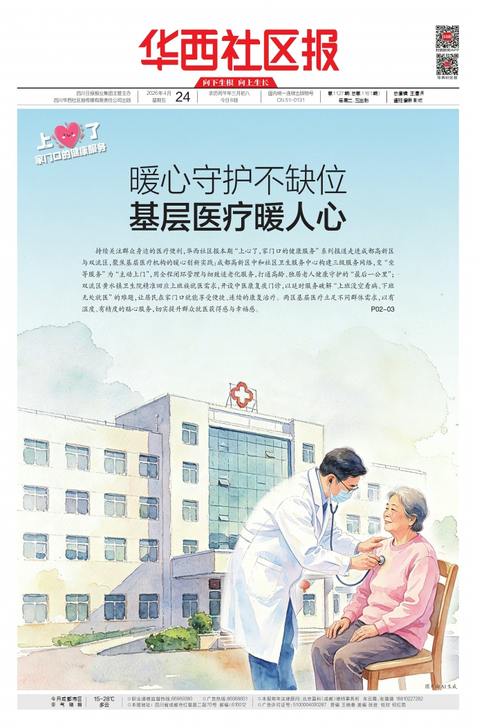 持续关注群众身边的医疗便利,华西社区报本期“上心了,家门口的健康服务”系列报道走进成都高新区与双流区,聚焦基层医疗机构的暖心创新实践:成都高新区中和社区卫生服务中心构建三级服务网络,变“坐等服务”为“主动上门”,用全程闭环管理与细致适老化服务,打通高龄、独居老人健康守护的“最后一公里”;双流区黄水镇卫生院精准回应上班族就医需求,开设中医康复夜门诊,以延时服务破解“上班没空看病、下班无处就医”的难题,让居民在家门口就能享受便捷、连续的康复治疗。两区基层医疗立足不同群体需求,以有温度、有精度的贴心服务,切实提升群众就医获得感与幸福感。 P02-03