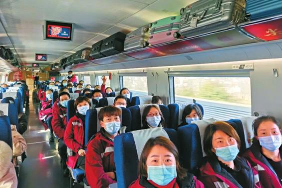 ◀18日,四川大学华西医院支援河北医疗队在前往石家庄的动车上。
