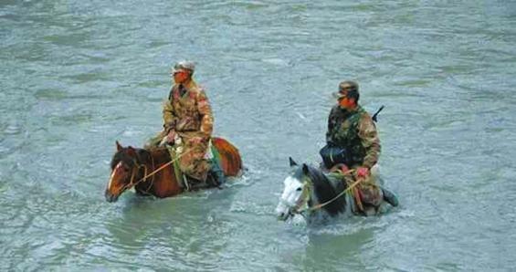 巡逻途中,祁发宝和战友骑马穿越湍急的河流。(资料图片)