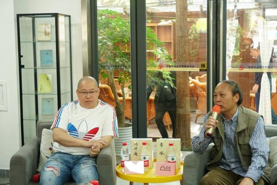 4月24日,作家聂作平(左)、凸凹在“巴金书屋”摆起了四川历史名人的“龙门阵”。