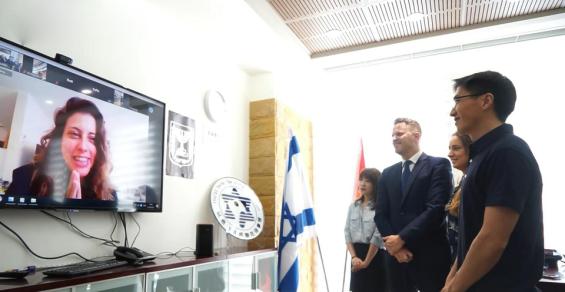 5月11日,以色列驻成都总领事馆内,蒋伟与玛阿雅视频连线。(视频截图)