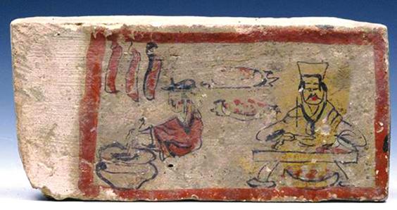 烤肉串是草原游牧民族的习俗,有学者考证它最迟自西汉初传入中原本土。一块嘉峪关长城博物馆藏画像砖,描绘了仆人呈奉烤肉串给主人的画面。主人位于画面右方,坐于榻上,戴帻着袍,右手持便面(遮面的扇子),榻前置盘以放肉串;其左右分别有朱色榜题“幼洁”“段清”,可能分别为其表字与名字。仆人则位于画面的左方,头戴尖顶帽,左手举一支串满烤肉条的“三叉戟”进奉给主人,肉香扑鼻。主人持便面,既为当时流行习俗,也为驱散烤肉的烟火以便食用。