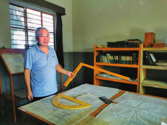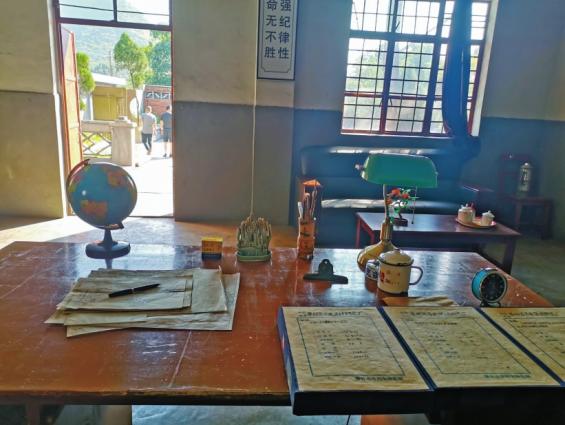房屋内,木桌子、腊纸、温水壶、搪瓷杯等还原了当年的模样。堆满了图纸的设计桌上,还摆放着橙色的尺子和量角器。柜子里,陈列着当年的文件袋。办公桌上,还躺着一张沾满灰尘的1976年9月14日的《四川日报》。墙壁上的“世上无难事 只要肯攀登”提醒到访者,三线建设者们干劲十足。而寝室里床上的枕巾上,标注着这是来自上海毛巾厂的产品。还有那门帘,用白色的的确凉布手绣着飞禽与花鸟。食堂窗口,还用藤编器物装满了渡口水泥厂一分、二两的饭票……