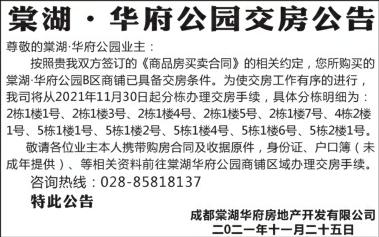 棠湖华府公园交房公告