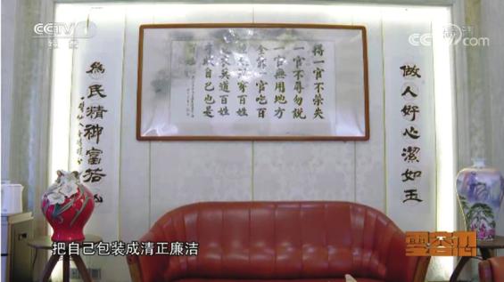 ◀王富玉在其别墅客厅里满墙挂的文字,都在标榜自己心系百姓、淡泊名利。墙上文字和豪华别墅的反差,恰是王富玉“两面人”做派的生动写照。 央视视频截图