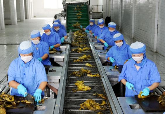 四川道泉老坛酸菜有限公司生产车间内,工人正对菜品进行分拣切分。