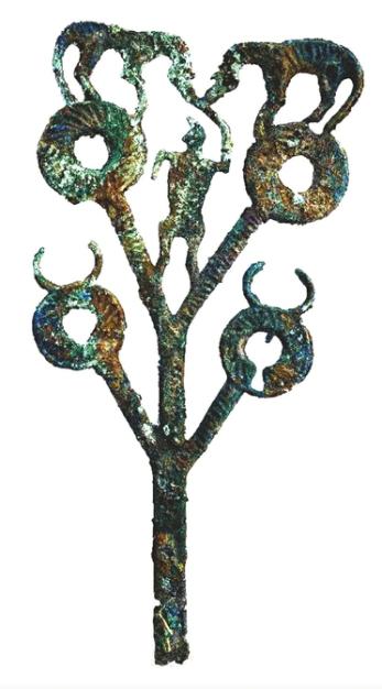 ◀M1056出土铜枝形器(一人双马)