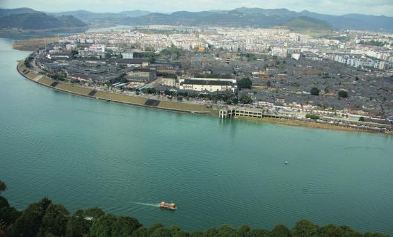 阆中古城位于嘉陵江中部,波涛汹涌的嘉陵江如一条巨龙环绕着阆中古城,又似一条湛蓝晶莹的宽幅玉带环绕着阆中古城。阆中古城四周是蜿蜒起伏、高低错落、茂密翠绿、繁花烂漫的群山,四周环山,三面环水,水在山中,城在水中央,如天工神手描绘的大自然山水城巨幅画卷。