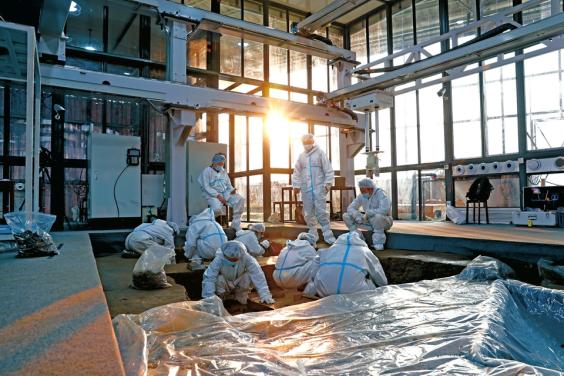 三星堆祭祀区新一轮发掘取得巨大收获。图为考古工作者在发掘舱中工作的场景。