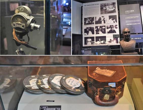 左上图:南京安全区国际委员会委员、美国牧师约翰·马吉拍摄南京大屠杀暴行所用的电影摄影机;下图:约翰·马吉的胶片盒等文物;右上图:约翰·马吉塑像及1938年5月美国《生活》杂志刊登的10幅由约翰·马吉胶片翻拍的南京大屠杀照片。 (拼版照片)新华社发