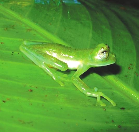 只有曲别针大小的玻璃蛙是夜行动物。它们白天栖身树叶下睡觉时,把全身绿色皮肤变成一片透明,使得自己在日光照射之下好似露珠,以便躲过蜘蛛、蛇等天敌的捕食。到了夜间,它们醒来觅食或交配,身体又要变为一种不透明的红棕色。