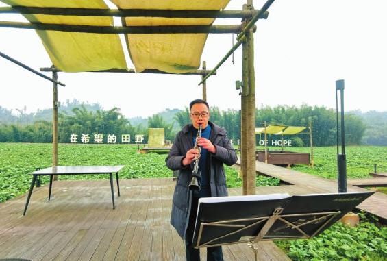 游客在田野吹奏乐器。