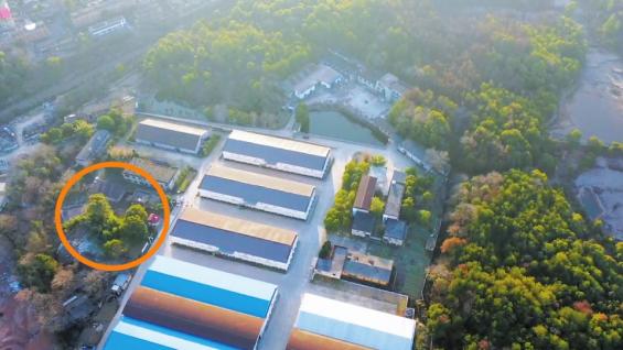 山林里分布着一些废弃的建筑,一片厂房区域被两米左右的围墙环绕,围墙在密林中延伸,阻断了前进的方向。记者向南迂回半小时,再向东北方向折返,翻过一堵长长的砖墙,下坡可以看到一条公路,路的对侧是一片高大的仓库。至此,总耗时1小时。据村民介绍,这些高大的仓库是早年建成的粮库。