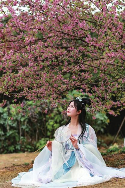身着华服赏樱花。陈元和摄于青龙湖