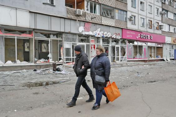 2022年4月19日,在马里乌波尔,当地居民从被损坏的建筑旁走过。新华社发