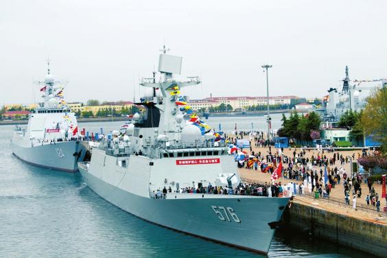 海军在山东青岛港3号码头组织舰艇开放活动,导弹护卫舰大庆舰(前)和导弹驱逐舰开封舰在靠泊展示(4月22日摄)。 新华社发