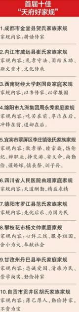 2017年,省纪委机关、省委宣传部、省精神文明办联合举办了首届“天府好家规”评选活动。全省各市(州)、省直各部门尽皆参与,共征集整理家规家训400余条、家风故事800余个。经大众评选(网络投票)和专家评审,报送首届“天府好家规”评选活动组委会审定,确定了十佳“天府好家规”及49项“天府好家规”提名。