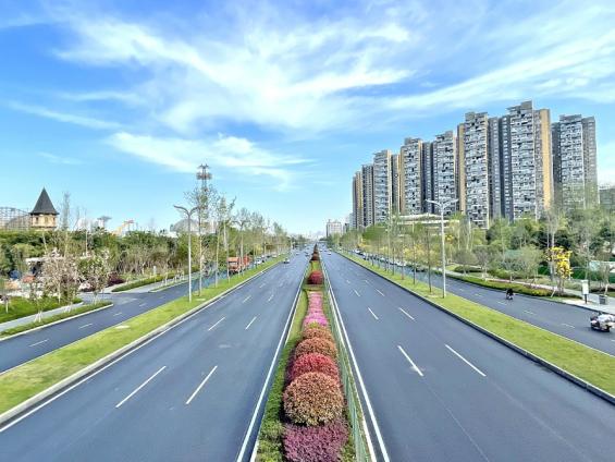 “项目沿线主要是以景观型街道空间为主,我们把侧分带加宽至4.5米,将慢行系统融入两侧绿地进行一体化打造,不仅对出入口段慢行更友好,还能使辅道车辆行驶更顺畅。”李波介绍,沿线绿化景观方面按照“一步一景,四季有景”原则,形成了“春赏樱花、夏观紫薇、秋览银杏、冬品红梅”的独特观景体验。
