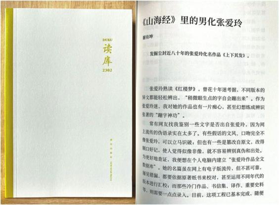 近些年,张爱玲的佚文不断被学者发掘“出土”,成为一个文学现象。2023年5月,最新上市的《读库》2302期上刊发了一篇名为《〈山海经〉里的男化张爱玲》的文章。作者谢有坤经过认真详细的论证与考据后认为,1946年4月10日发表在苏青主编方型旬刊《山海经》创刊号上的一篇文章《上下其发》,是张爱玲化名“连云”所写。近80年来,仅有上海的一家八卦小报在1946年猜测《上下其发》出自张爱玲之手,但此文刊于何处,一直罕有人知。如今这篇文章被谢有坤发掘出来,在《读库》全文发表,并配上考证的详细过程,吸引不少读者关注。