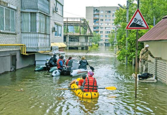英国国防部警告,尽管该水电站大坝尚未被完全冲垮,但“接下来几天情况可能进一步恶化,引发新的洪水”。据新华社6月8日,居民在赫尔松州乘船出行。新华社发