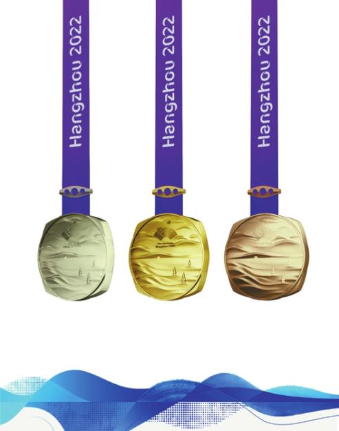 源自五千年良渚文明,展示中国江南文化,呈现杭州山水景观。在亚运会奖牌设计中首次将方形玉琮和圆形奖章融为一体,其中奖牌正面用凸出的线条勾勒出“三面云山一面城”的杭城画卷,湖水涟漪,山峦起伏;奖牌背面,形似方形印章,寓意运动员们在杭州亚运会上留下美好的印记。